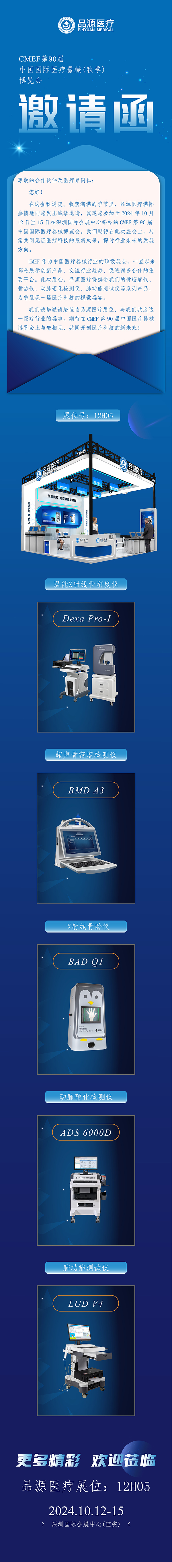 CMEF 作為中國醫(yī)療器械行業(yè)的頂級展會(huì),一直以來都是展示創(chuàng)新產(chǎn)品、交流行業(yè)趨勢、促進(jìn)商務(wù)合作的重要平臺(tái)。此次展會(huì),品源醫(yī)療將攜帶我們的骨密度儀、骨齡儀、動(dòng)脈硬化檢測儀、肺功能測試儀等系列產(chǎn)品,為您呈現(xiàn)一場醫(yī)療科技的視覺盛宴。我們誠摯邀請您蒞臨品源醫(yī)療展位12H05,與我們共度這一醫(yī)療行業(yè)的盛事。期待在 CMEF 第 90 屆中國醫(yī)療器械博覽會(huì)上與您相見,共同開創(chuàng)醫(yī)療科技的新未來!