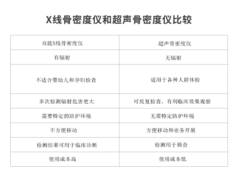 ■ 目前用于臨床的骨密度測量儀器有兩大類,即雙能X線和超聲骨密度測試,雙能X線骨密度儀是行業(yè)檢測標準,準確度高,但從安全性方面超聲骨密度儀有明顯優(yōu)勢,這對人們日益敏感的輻射保護非常重要,比較如下。